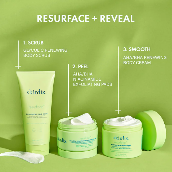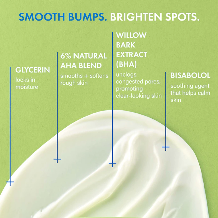 A luxurious AHA and BHA exfoliant body cream visibly smooths rough, bumpy, crepey skin while moisturizing with shea butter, jojoba oil and glycerin.